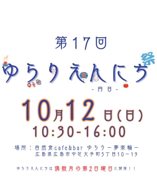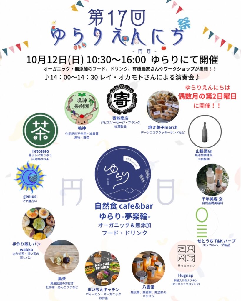 オーナーが、昔ながらの日本の食生活に戻し、健康を維持することでなるべく医療のお世話にならないことが、未来の若者を守ることにつながると考え、可能な限り農薬や化学肥料、食品添加物を使用していない食材や調味料で調理したメニューを提供しているお店で、『ゆらりえんにち』は2か月に1回偶数月に開催される「有機野菜の販売や、オーガニック、無添加の食材を使ったフードなどのお店」が出店する“えんにんち”です。
