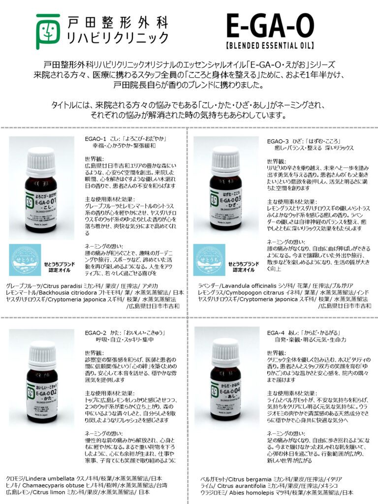 オリジナルを開発するにあたっては、使う環境やそこにいる人たちがどんな意識を持っているのか、そんな人たちにとってどんな植生の香りを使うのかが良いかなど、半年近く計画を練り、素材探しと素材調達の調整も含めて実現したのが戸田整形外科リハビリクリニック様の「EGAOシリーズ」です。